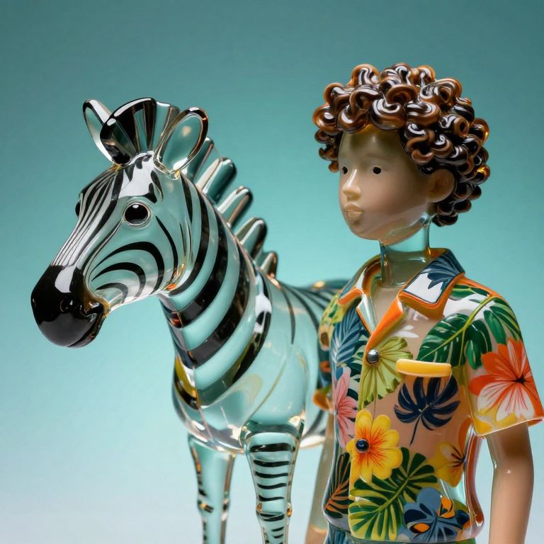 The image features a striking composition with a human-like figure and a glass animal. The figure, positioned on the right side, has curly hair and is wearing a colorful, patterned shirt adorned with tropical leaves and flowers. The glass animal, which appears to be a zebra, is superimposed on the left side of the image, with its head and upper body visible. The zebra's stripes are vivid and detailed, contrasting with the smooth, reflective surface of the glass. The background is a gradient of teal, providing a serene backdrop that enhances the vibrant colors of the figure and the glass zebra. The overall composition is dynamic, with the figure and the glass zebra interacting in a visually engaging manner, creating a sense of depth and intrigue.