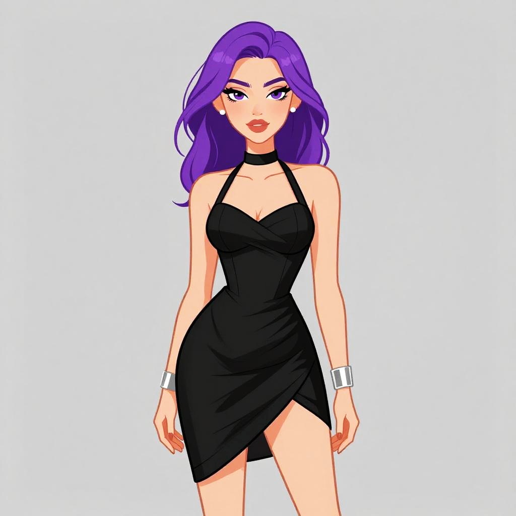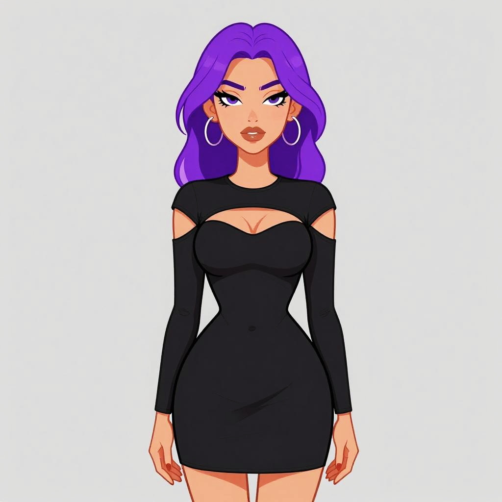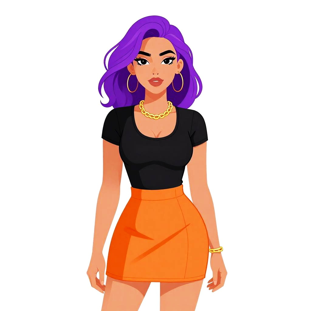 Woman with pretty face and pretty hair. Woman, contemporary chic, black long-sleeve fitted top, scoop neckline, faux leather mini skirt in burnt orange, high-waisted, seamless front, back zipper, delicate silver necklace, white seamless background. --sref 1467
