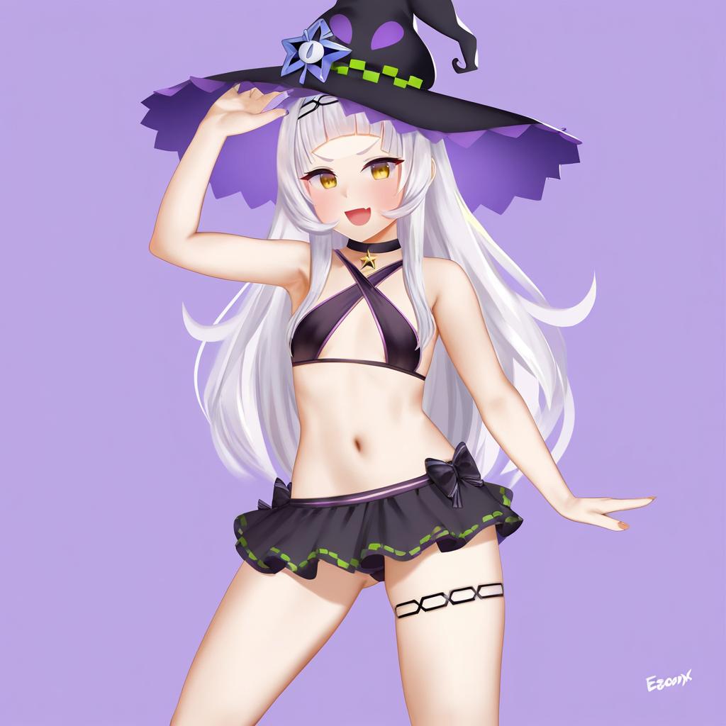 Murasaki shion (hololive summer 2019), hololive, 1girl, yellow eyes, orange eyes, v-shaped eyebrows, grey hair, long hair, white hair, blunt bangs, arched bangs, sidelocks, hairband, small breasts, thighs, navel, black bikini, bikini skirt, witch hat, bare shoulders, black choker, virtual youtuber, virtual youtuber, criss-cross halter, stomach, bare arms, by artist easonx, leet