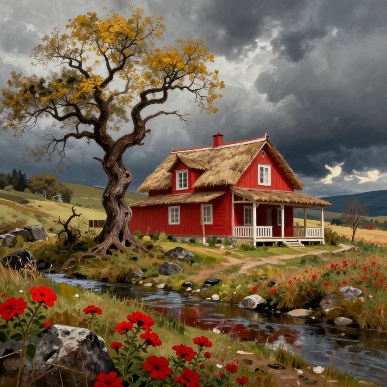The image depicts a striking landscape scene with a red, two-story house situated on a hillside. The house, reminiscent of a traditional homestead, features a thatched roof and a veranda with columns, exuding a rustic charm. To the left of the house stands a large, gnarled tree with a twisted trunk and sparse, yellowing leaves, adding a sense of age and history to the scene. The foreground is adorned with vibrant red flowers and rocky terrain, leading the eye towards the house. A small stream flows gently through the landscape, reflecting the sky and adding a serene touch. The background is dominated by a dramatic, stormy sky with dark clouds, contrasting with the warm hues of the house and flowers. The overall composition is balanced, with the house and tree serving as focal points, while the stream and flowers create a harmonious balance of elements. The style of the image combines elements of homestuck and ivan laliashvili, with a touch of lovis corinth, evident in the rich, expressive brushstrokes and the interplay of light and shadow.