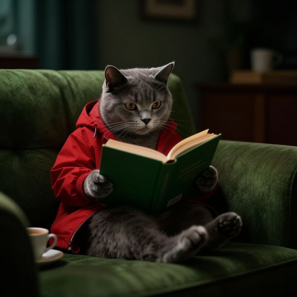 Cinematic film still ((photo:1.2)), A beautiful and cute gray cat reading a green book sitting on a green couch and drinking coffee in a living room, dramatic lighting, dynamic pose, dynamic camera, masterpiece, best quality, dark shadows, ((dark fantasy)), wearing a red jacket, detailed, realistic, 8k uhd, high quality, high quality . shallow depth of field, vignette, highly detailed, high budget, bokeh, cinemascope, moody, epic, gorgeous, film grain, grainy