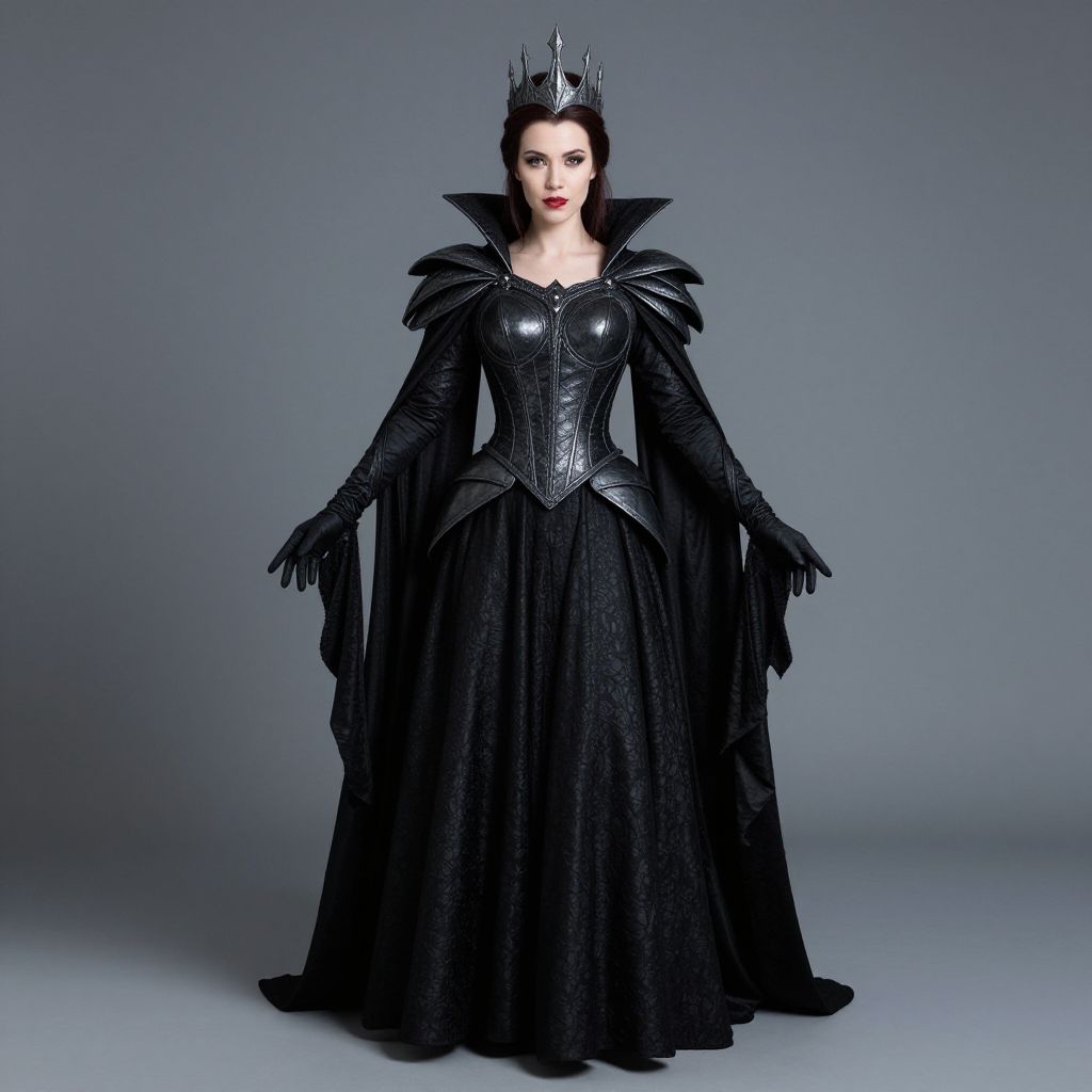 Evil queen ravenna costume, 1girl, solo, cape, standing, dress, gloves, crown, full body, black dress, armor