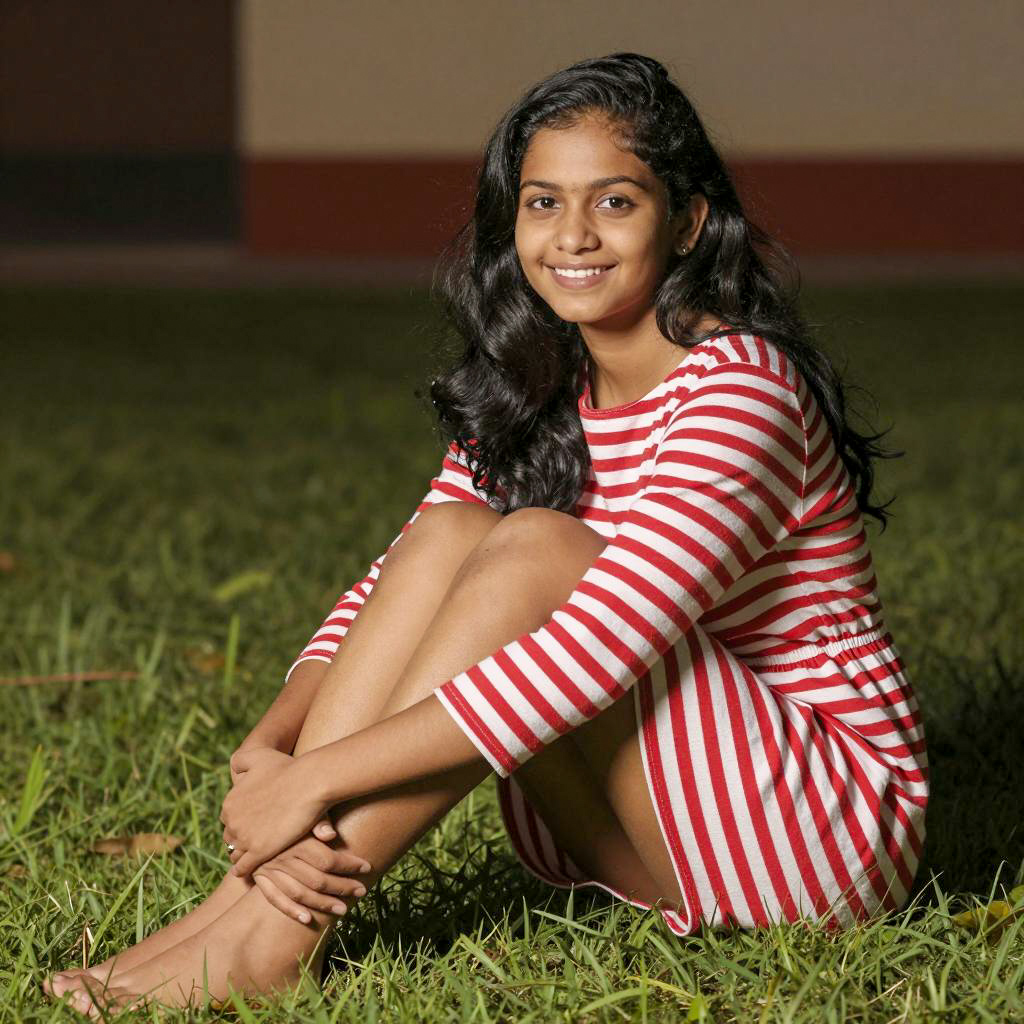 Young woman with medium brown skin and long brown hair in a red, sleeveless dress standing among blooming orange and pink roses. She smiles broadly, arms crossed over her stomach. Wearing gold hoop earrings and a gold necklace. Green foliage and blurred trees in the background. Foreground roses are in focus. Bright, natural lighting. Photographic style.