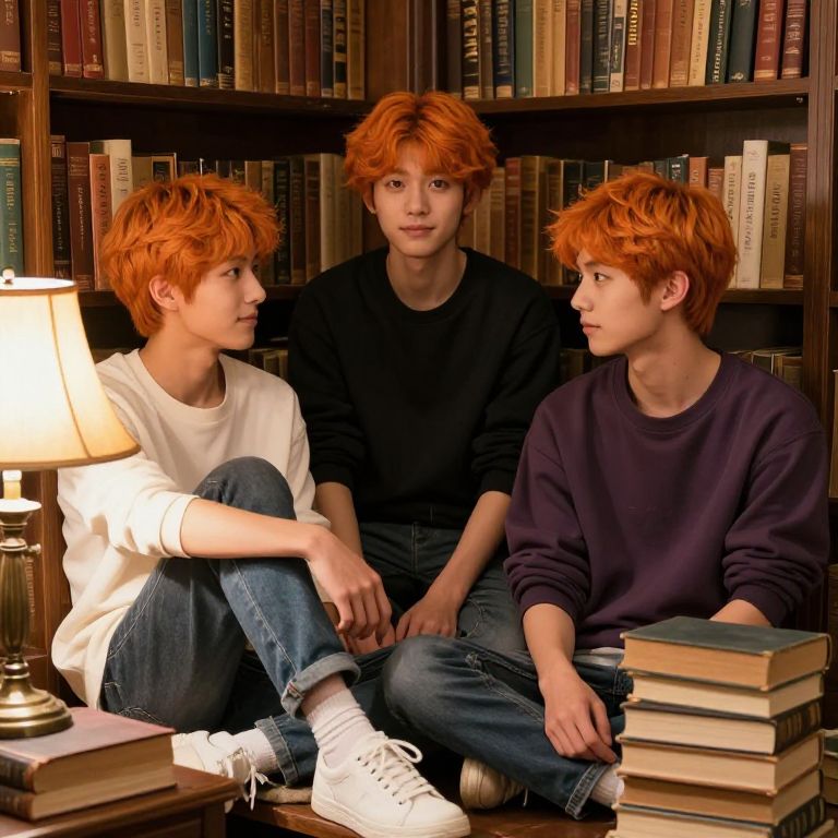 Orange hair boys standing in a sunlit urban street, vibrant autumn leaves falling around, casual modern clothing, expressive faces, cinematic lighting, high detail