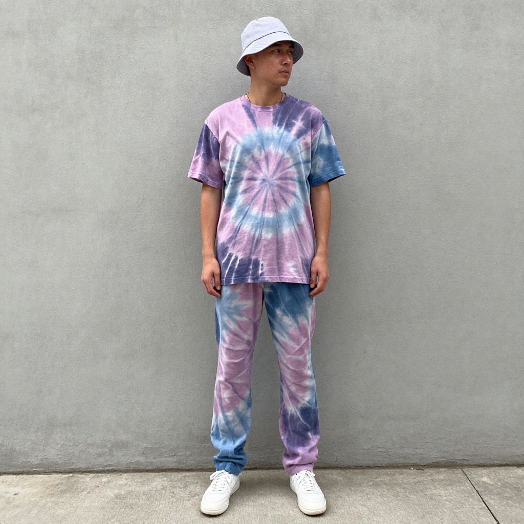 Photograph of a young man standing against a gray concrete wall, wearing a white bucket hat, tie-dye shirt and pants, and white sneakers.
