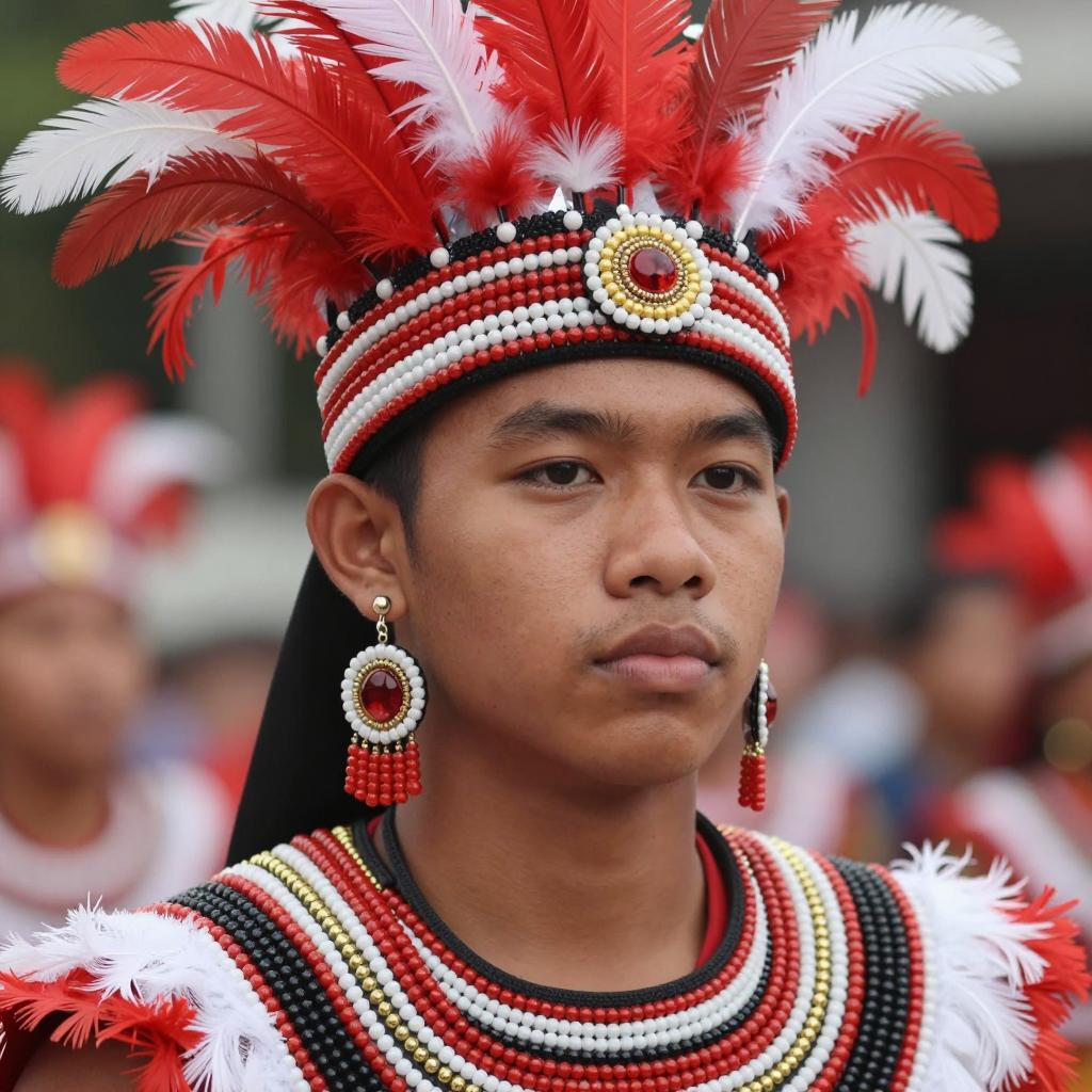 Portrait of a young Filipino man wearing a traditional Buwan ng Wika costume featuring a red and white feather headdress, intricate beaded jewelry including earrings, a necklace, and a headband. The subject has black hair, a natural tan complexion, and a focused expression, photographed from the upper body with a blurred background.