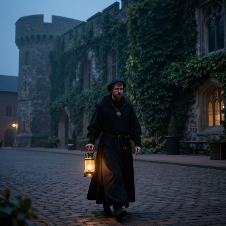 Medieval cigarettes made from dried barley and herbs, smoked by a cloaked monk in a stone abbey courtyard at dusk, atmospheric and historically inspired
