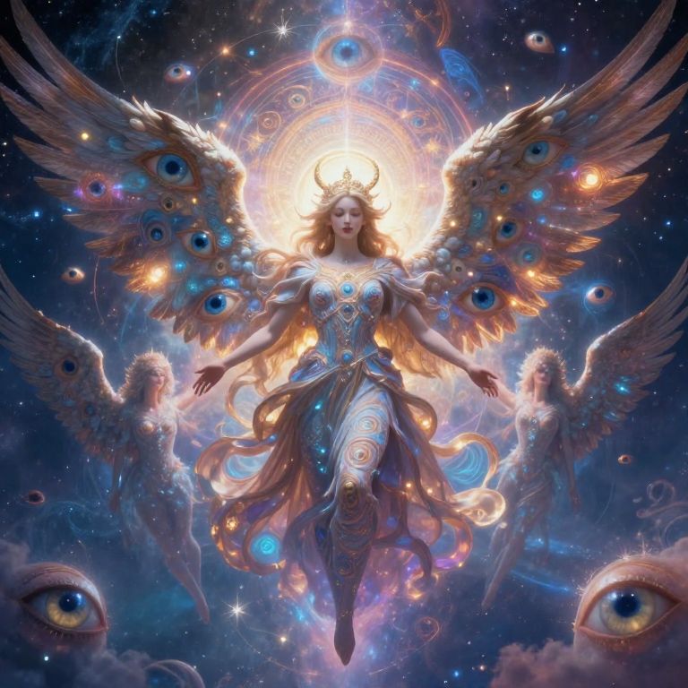 Digital fantasy artwork of a celestial goddess with flowing blonde hair, glowing golden halo, and large, peacock-feathered wings adorned with blue eyes. She wears an ornate, silver and blue gown with intricate patterns. Her arms are outstretched, and she floats against a cosmic backdrop of stars, planets, and swirling light. Two smaller, ethereal winged figures flank her, surrounded by floating eyes. The image combines elements of mysticism and surrealism, with vibrant colors and detailed textures.