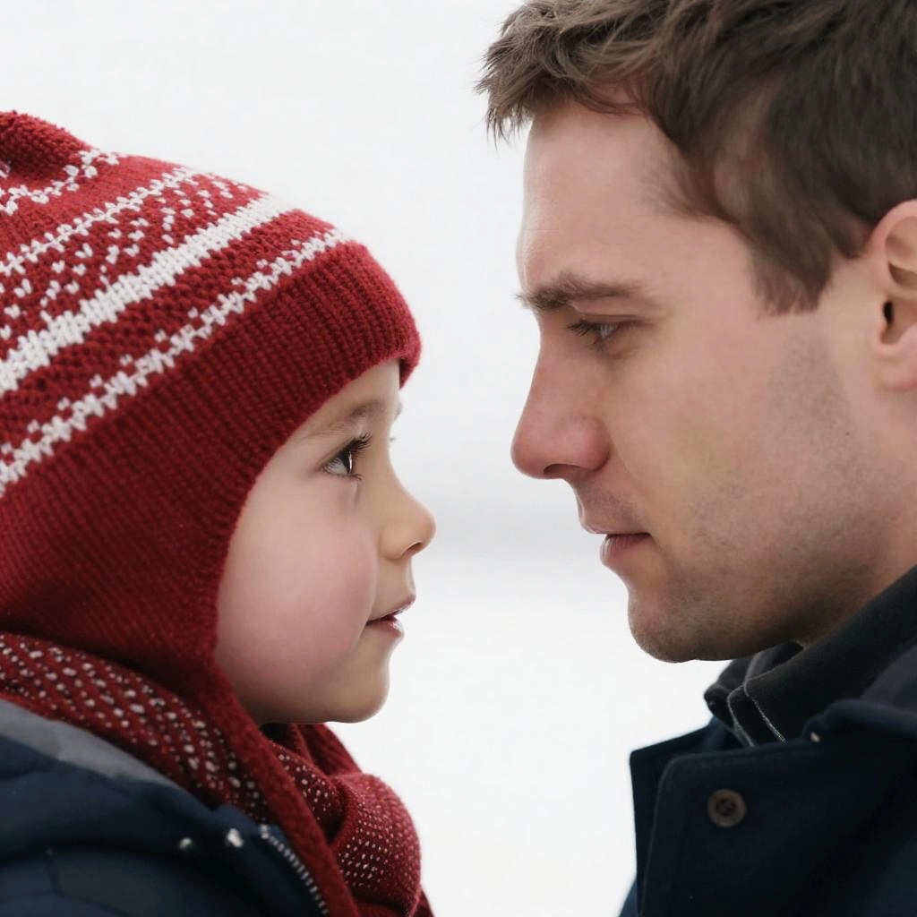 Photograph of a close-up, intense face-to-face profile view of a young child and an adult man. The child wears a knitted red and white hat with patterned stripes, looking at the man. The man has short brown hair, light skin, and a serious expression. Both individuals have their noses almost touching. The background is plain white. The child wears a patterned red scarf. The adult man wears a dark blue coat. The child's left eye is visible, showing a focused expression.