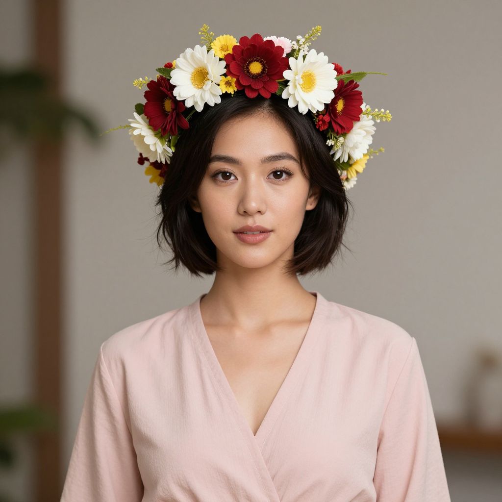 Photograph of an Asian woman with short black hair, wearing a pink V-neck blouse, adorned with a flower crown of white, red, and yellow
