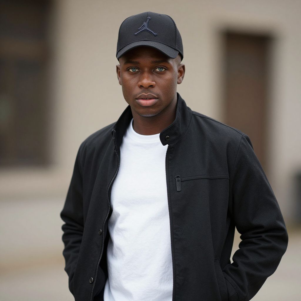 Outfit wear jordans costume, 1boy, male focus, solo, jacket, hat, dark-skinned male, realistic, blurry background, blurry, shirt, baseball cap, dark skin, black jacket, outdoors, white shirt, looking at viewer, open jacket, blue eyes, building, upper body, open clothes