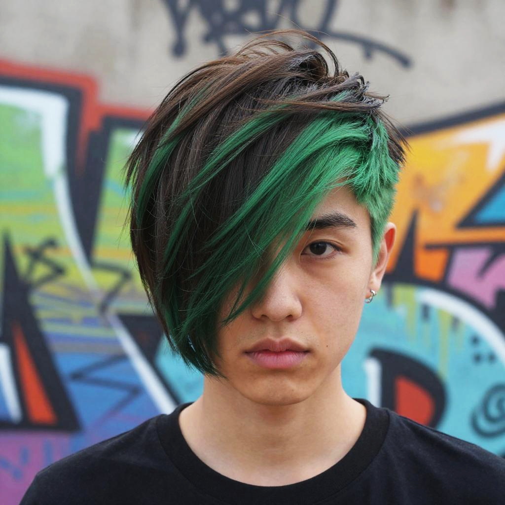 Dynamic street scene with a person sporting turquoise and black hair styled in a punk rock mohawk, adorned with metallic piercings and tattoos, gritty urban background featuring graffiti walls, evening lighting casting sharp shadows, edgy and contemporary style.