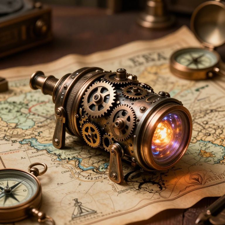 Steampunk-style brass clockwork lantern with glowing orange light on vintage map, surrounded by compasses and brass objects, creating a warm, intricate scene