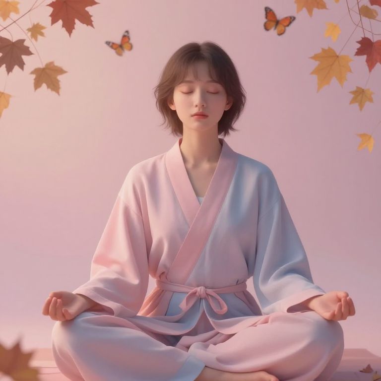 In a serene and cozy space, a person is depicted in a state of peaceful meditation, surrounded by warm, pastel lighting that casts a soft glow on the scene. The individual, with closed eyes and a tranquil expression, is adorned in a pastel-colored robe, which contrasts subtly with the muted shades of pink and blue that dominate the palette. The background features delicate, autumnal leaves and a butterfly, adding a touch of nature's tranquility to the setting. The composition is harmonious, with the person positioned centrally, creating a balanced and calming atmosphere. The interplay of colors, textures, and shapes enhances the overall sense of peace and introspection, making the image a captivating representation of a moment of quiet contemplation.