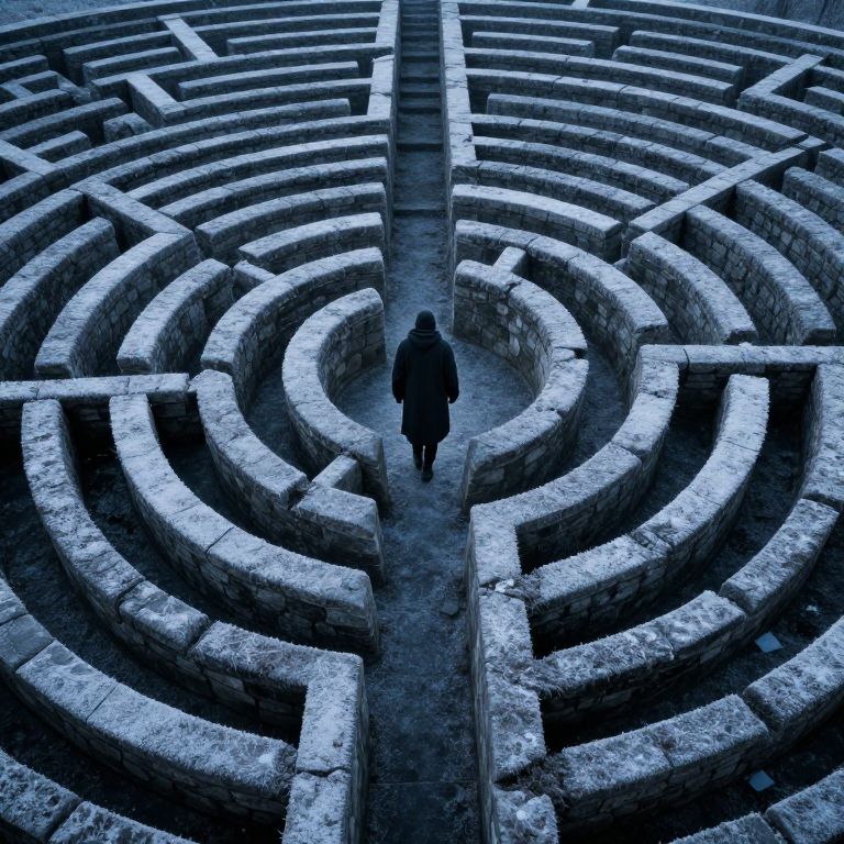 Amidst the spectral embrace of frost-kissed stone and the hush of forgotten echoes, a solitary figure traverses a labyrinth of infinite possibility, where each step dissolves into the void, leaving behind only the weight of introspection and the quiet ache of unspoken truths.