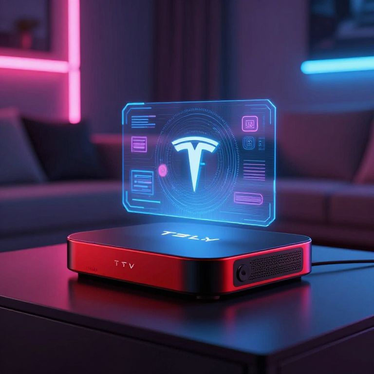 Tesla IPTV futuristic streaming device glowing with holographic interface, sleek black and red design, set in a modern living room with neon ambient lighting, ultra high definition, cyberpunk style