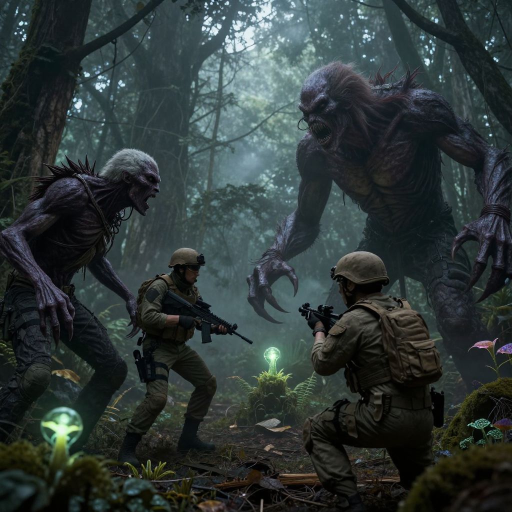 Monsters vs humans, a tense standoff in a dark forest, grotesque creatures with sharp claws facing off against armed human soldiers in tactical gear, misty environment with eerie glowing plants, high detail, dramatic shadows and intense expressions.