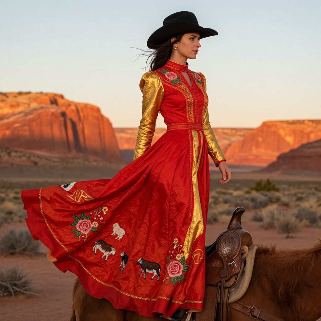 A vibrant western dress in rich crimson and gold, flowing gently in a sun-drenched desert wind, set against a backdrop of red rock cliffs and a distant sunset. Detailed embroidery of roses and cattle patterns accentuates the fabric, worn by a woman standing on a wooden saddle, mid-ride, in a classic American frontier landscape.