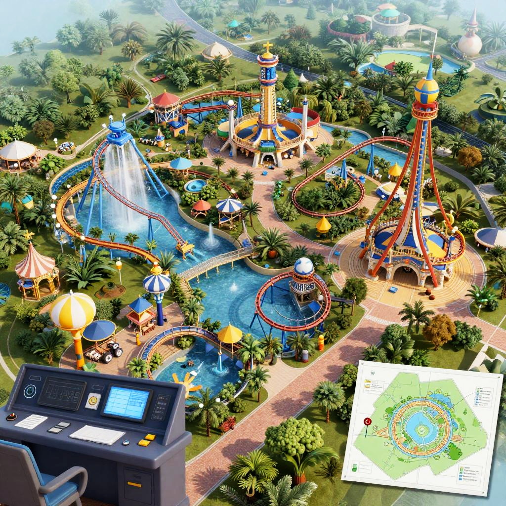Theme park maker concept showcasing a sprawling amusement park layout with innovative rides, water attractions, lush green spaces, detailed control panels and designers planning maps, digital art with a dynamic and creative mood