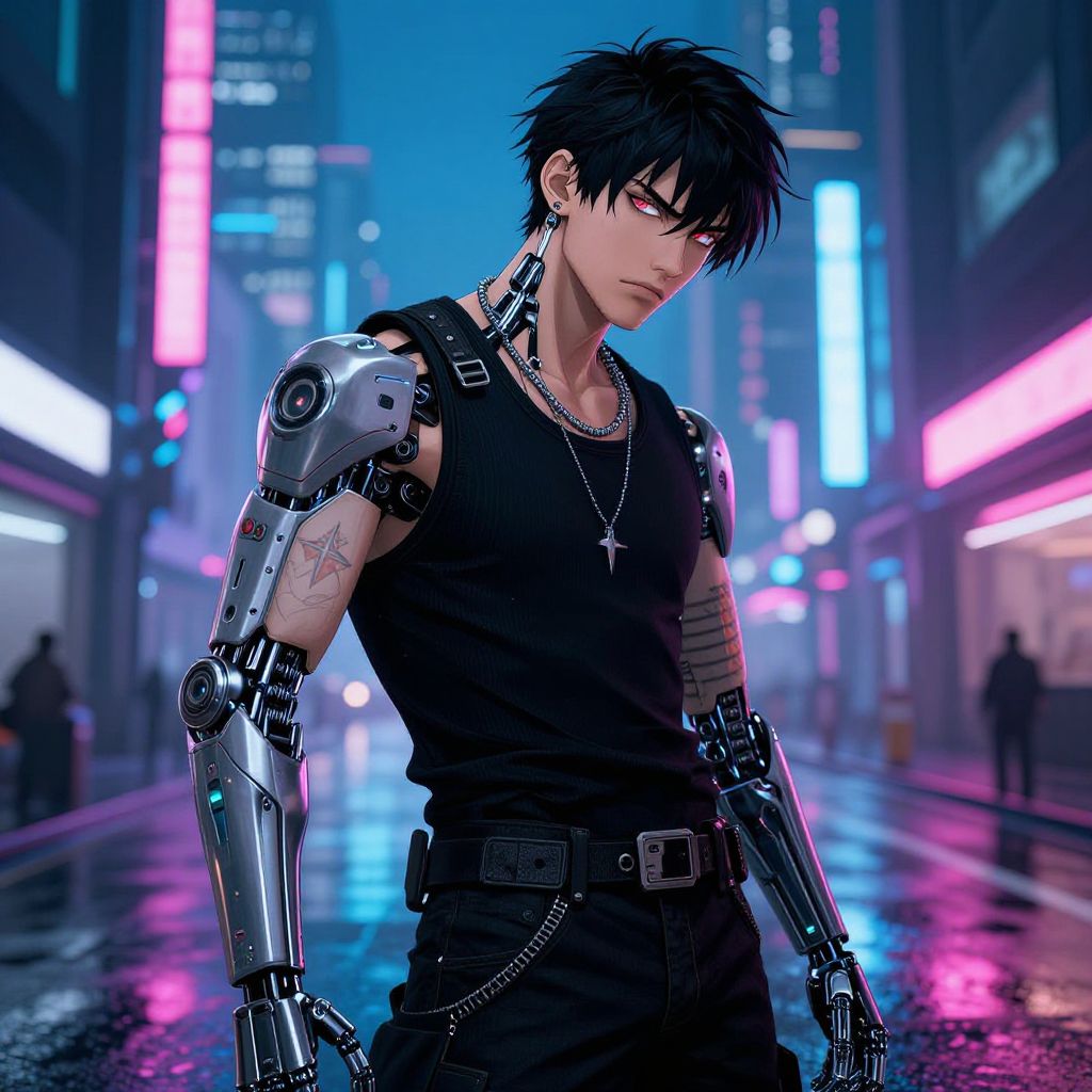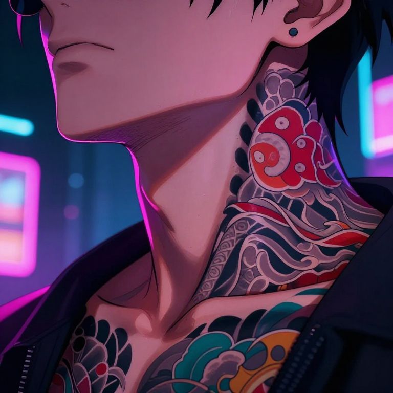 Close-up of anime character with detailed neck tattoos, combining traditional Japanese art styles with modern neon colors, illuminated by ambient city lights with a cyberpunk aesthetic, highlighting sharp contrasts and textured ink patterns.