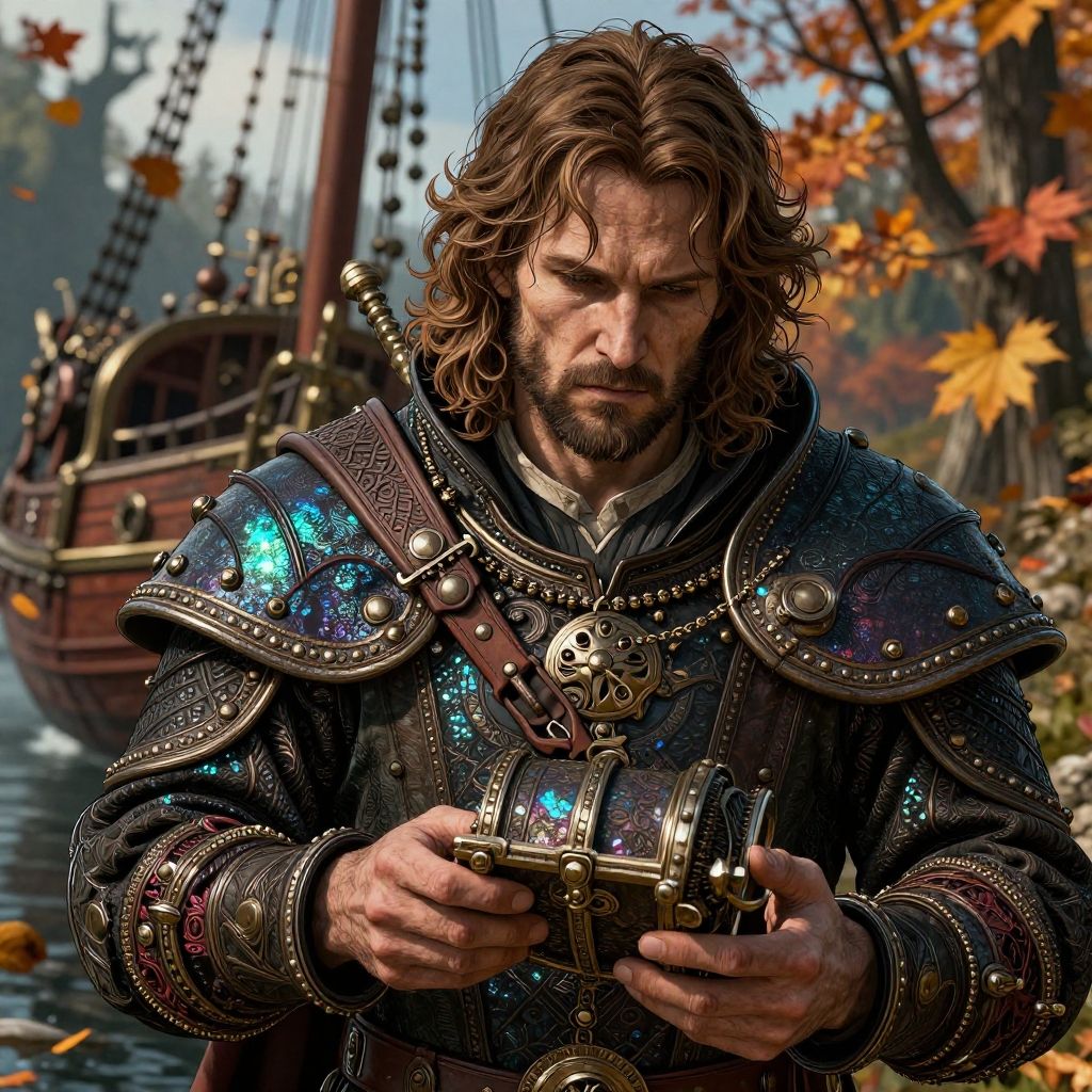Digital artwork of a rugged, bearded man with wavy brown hair, wearing intricately detailed, dark metallic armor adorned with blue gemstones. He holds a small, ornate, glowing blue box in both hands. Behind him, a wooden ship with tall masts and rigging stands on a calm lake, surrounded by autumnal trees with orange and yellow leaves. The man's intense expression and the rich textures of his armor contrast with the serene, colorful background. The image has a realistic yet slightly fantastical style.