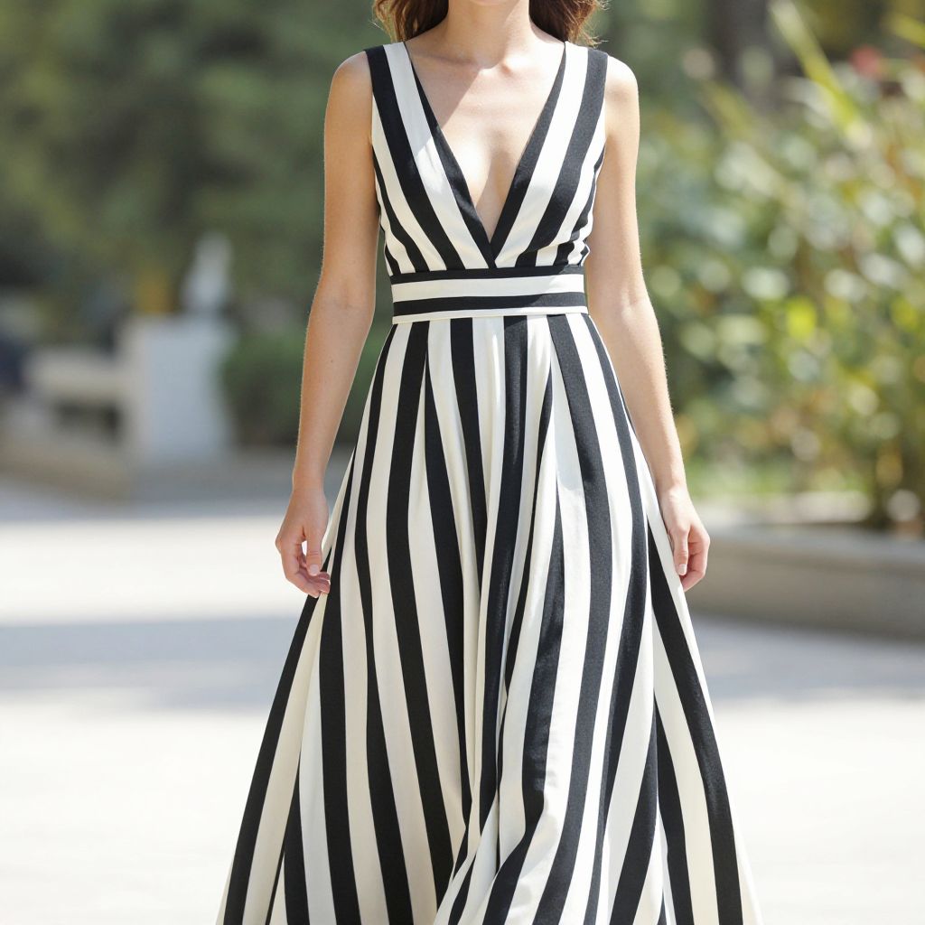Photograph of a woman in a sleeveless, black-and-white striped, V-neck, floor-length dress, standing outdoors with blurred greenery background.