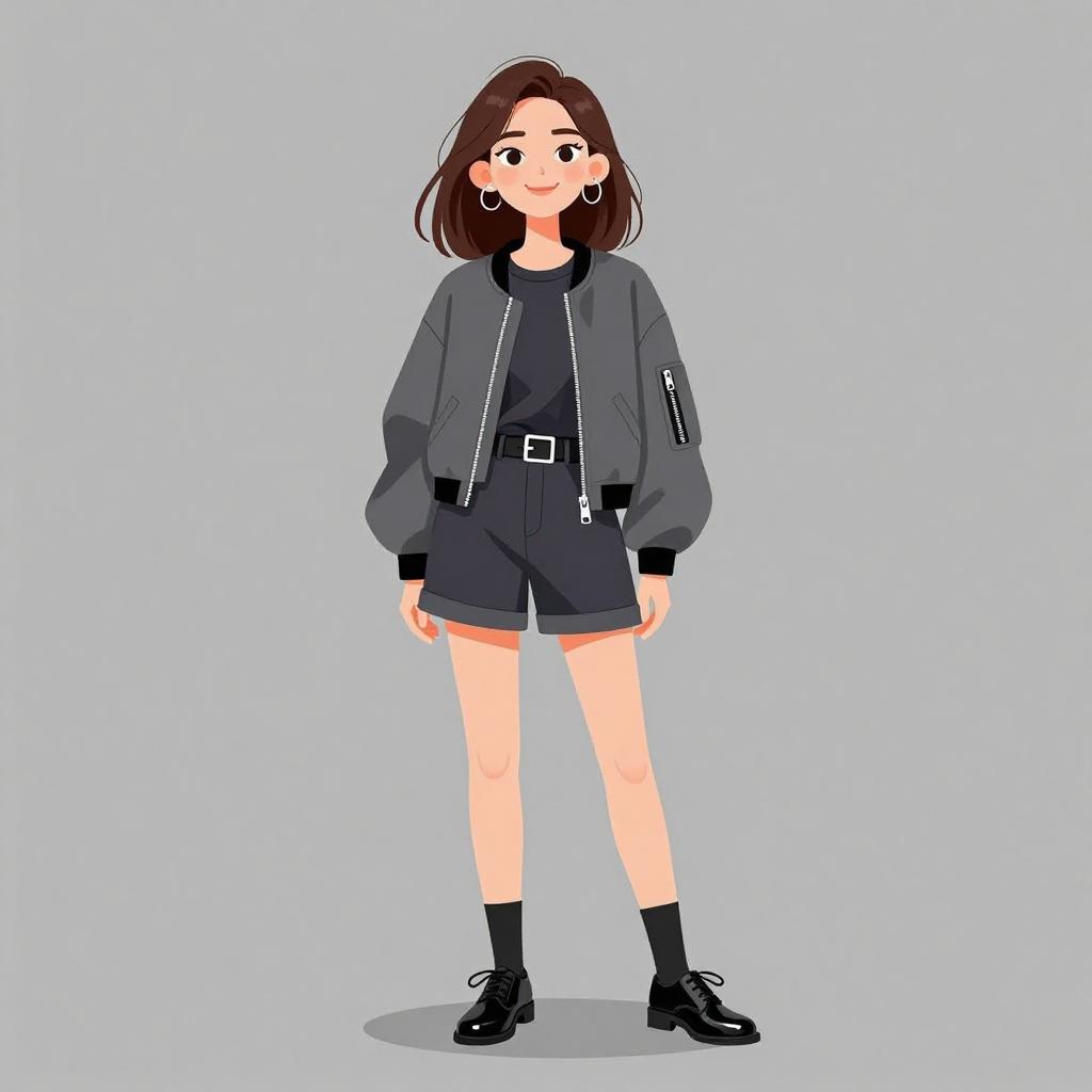 Woman with pretty face and pretty hair. smiling Woman, casual contemporary, gray bomber jacket, dark gray t-shirt, matching belted high-waist shorts, black ankle socks, glossy black Oxford shoes, photo studio background --sref 1467