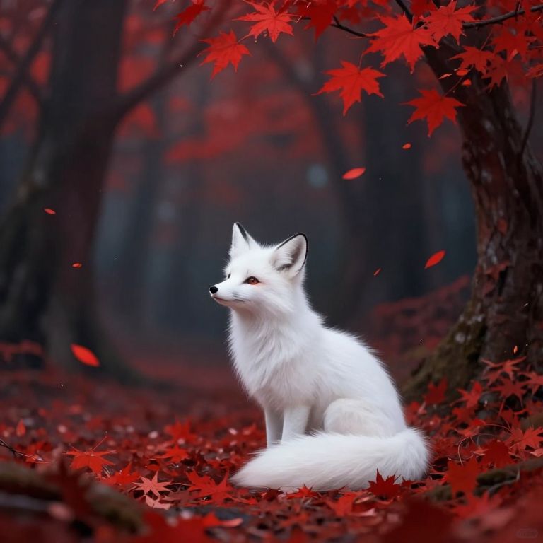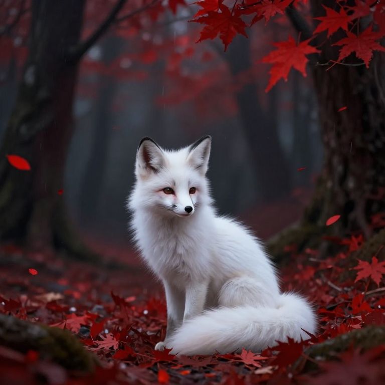 In the realm of fantasy, a small, pure white fox kit sits serenely amidst a storm of falling crimson leaves in a dark, mysterious forest, The ethereal atmosphere is accentuated by the soft and diffused lighting, with deep blacks and vibrant reds dominating the color palette, The scene evokes a sense of melancholic beauty, inspired by the works of Yoshitaka Amano and Artgerm, The smooth fur of the fox contrasts with the slightly blurry, almost ethereal texture of the leaves, while the background showcases a shadowy forest with implied depth, The overall rendering focuses on mood and atmosphere, with an impressionistic touch that prioritizes depth of field and a slight focus on the fox, This captivating illustration, with its cinematic qualities and poster-worthy appeal, transports viewers into a world of enchanting wonder