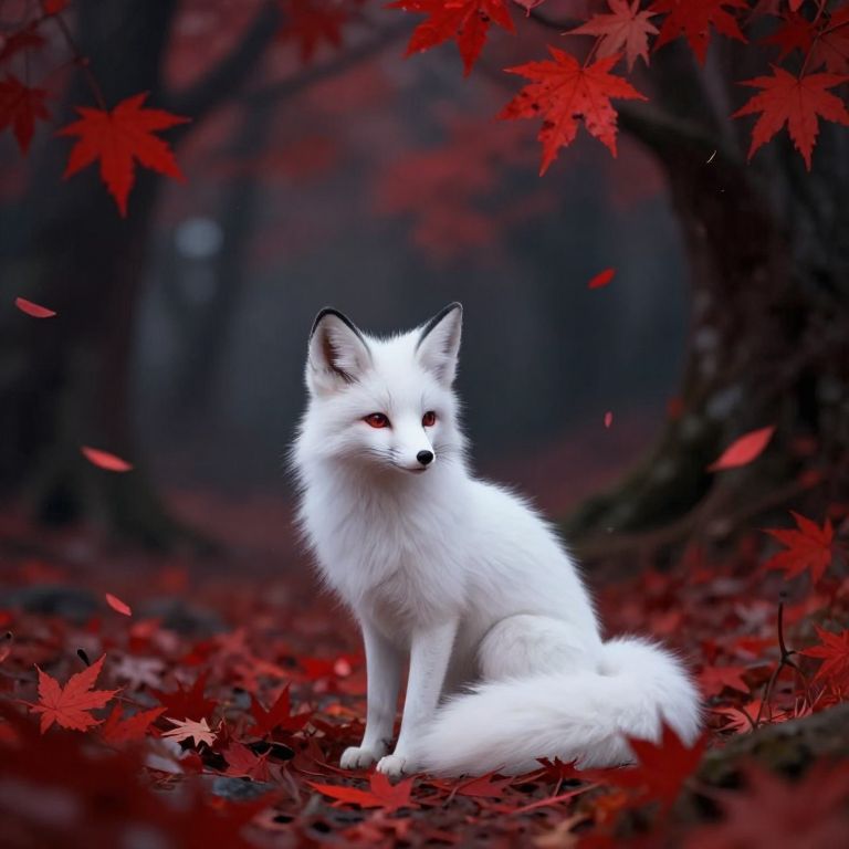 Photograph of a white fox with striking red eyes, sitting on a forest floor covered in vivid red leaves. The fox's fur is fluffy and pristine white, contrasting sharply with the dark, blurred background of tall trees and shadows. Red maple leaves surround the fox, some in the foreground and others scattered around, adding a vibrant, autumnal touch to the scene. The fox's black-tipped ears and bushy tail are prominent, and its gaze is directed at the camera, creating a sense of engagement. The overall mood is mysterious and enchanting, with a focus on the fox's pristine beauty against the rich, red foliage.