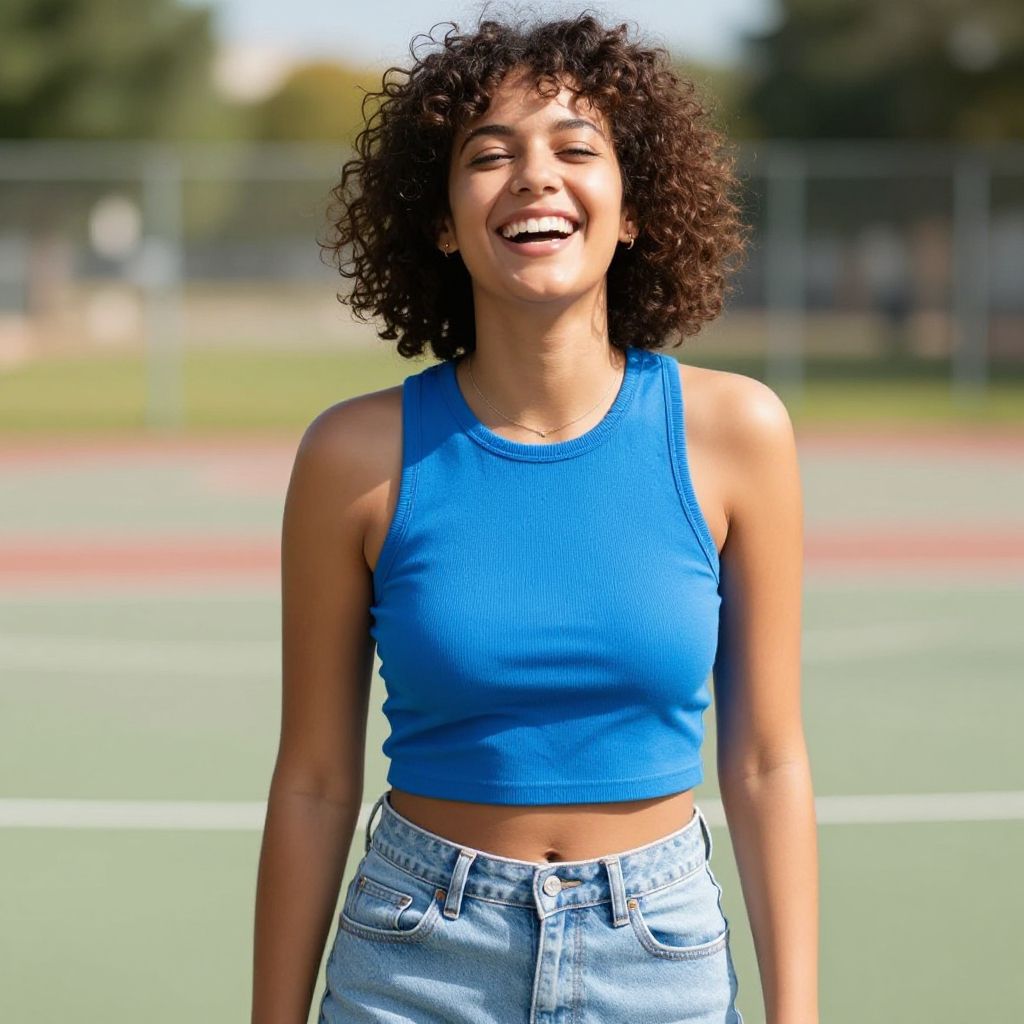 A happy young woman with short curly hair is laughing outdoors on a bright sunny day, standing on a basketball court. She wears a blue sleeveless crop top and light denim jeans, radiating a carefree and joyful summer vibe.