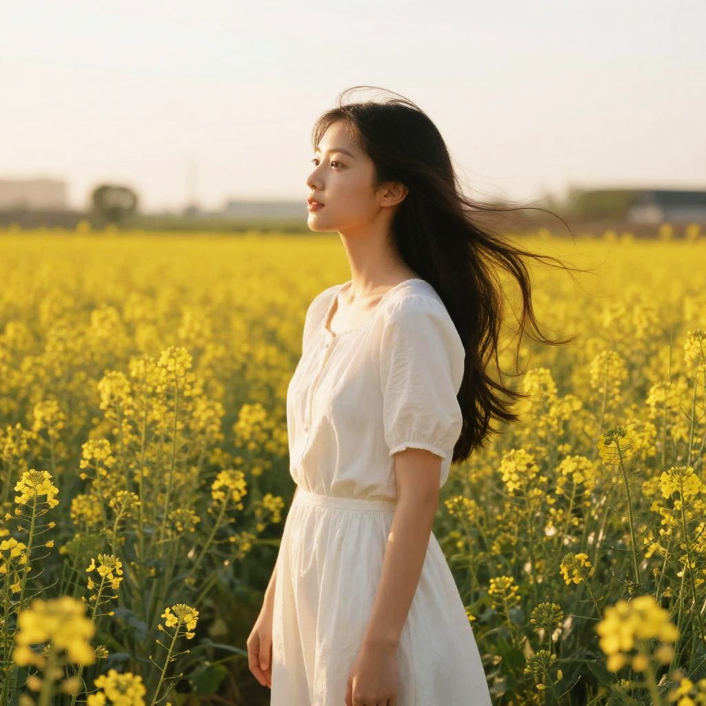 Stefany standing in a sunlit field of wildflowers, soft breeze moving through her hair, warm golden hour lighting, natural and serene expression, vivid colors in a painterly style, high detail, peaceful countryside setting