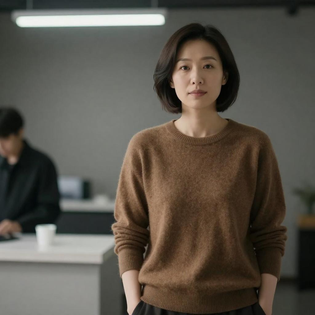Asian woman with medium skin tone and long black hair, wearing a light blue shirt and white cap, standing in front of tall modern apartment buildings. She looks slightly to the right with a neutral expression. Overcast sky in background. Urban setting.