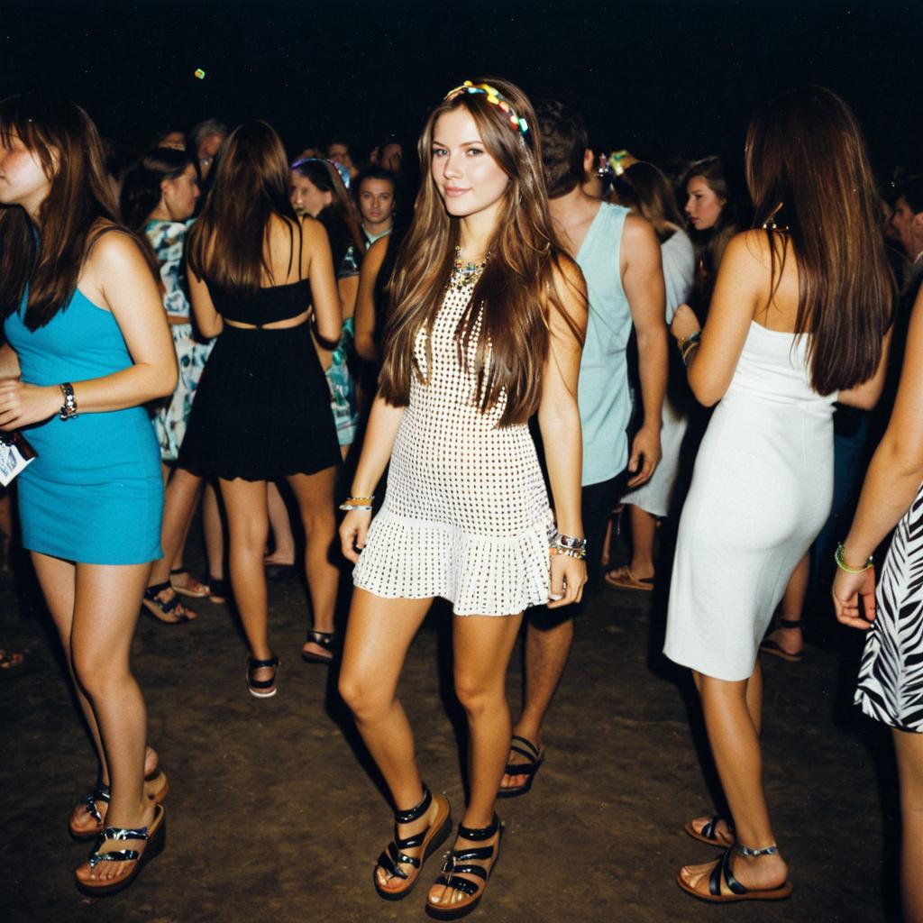 Rave themed party outfit,long hair, dress, 1girl, crowd, jewelry, sandals, solo focus, brown hair