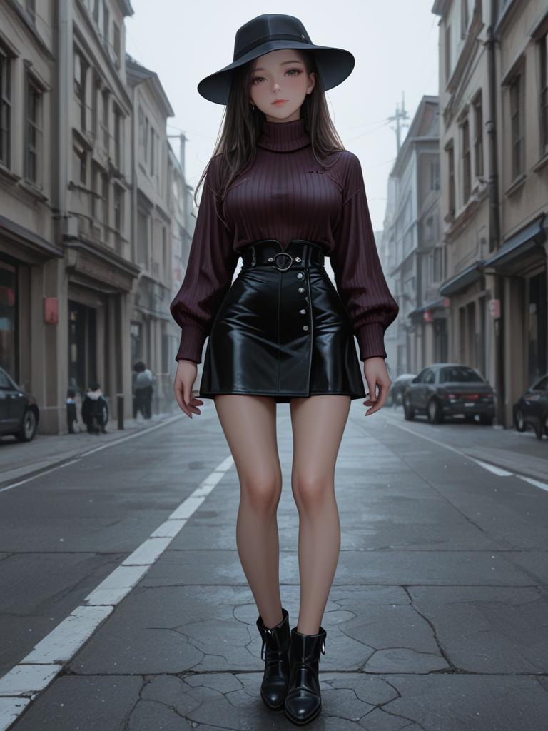 1girl, realistic face, full body shot, Woman, modern urban, ribbed turtleneck sweater in burgundy, long sleeves, fitted silhouette, paired with a high-waisted faux leather mini skirt in black, diagonal zipper detail, wide-brimmed felt hat in taupe.