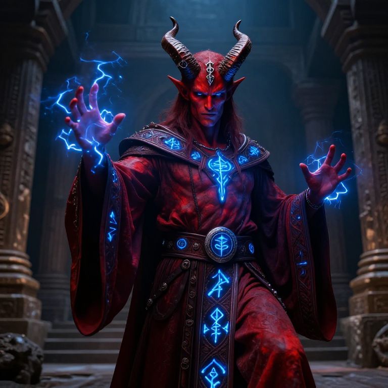 Male tiefling DnD sorcerer casting dark magic in ancient ruined temple, scarlet skin contrasted with glowing blue arcane symbols, long flowing robes with intricate patterns, sharp horns adorned with silver rings, electric energy crackling around hands, mystical atmospheric lighting.