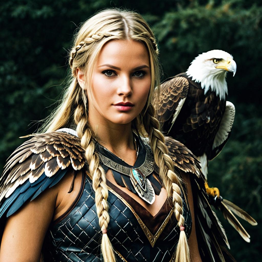 Wildlife warrior costume, photorealistic, young white woman with long wavy blonde hair, wearing tribal-style green dress with brown leather straps and arm bands, brown belt with pouches, standing in front of a deer, background with bison and green forest, natural light, realistic ures, fantasy setting, outdoor, daytime, detailed, cinematic, strong and determined expression, wilderness, nature, Native American-inspired attire