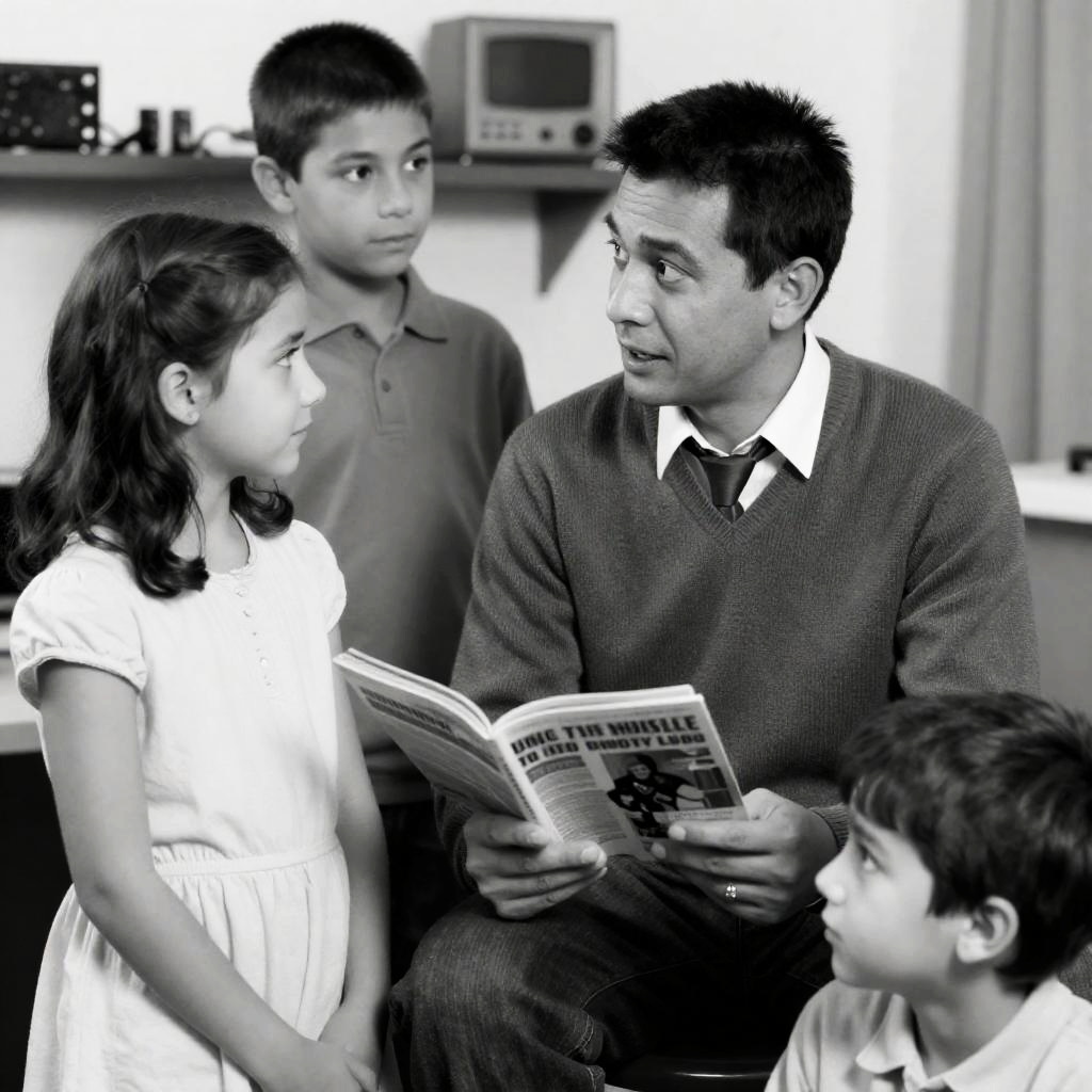 Black-and-white photograph of a man with short, dark hair, wearing a sweater and tie, holding a magazine, talking to a girl in a light dress and two boys, one standing and one sitting. Background includes a shelf with electronic components. The man looks to the right, the girl looks forward, and the boys have neutral expressions. The setting is indoors.