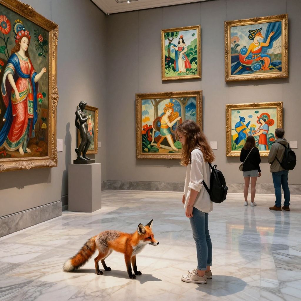 A girl is looking down a baby fox that it is in the floor. Inside a museum with art painting. Vivid colors, intricate details, realistic style, oil paintings, acrylic paintings, watercolor paintings, digital illustrations, mixed media pieces, sculptures casting shadows, spotlights accentuating select works, marble floor reflecting scattered rays, spectators admiring displayed creations