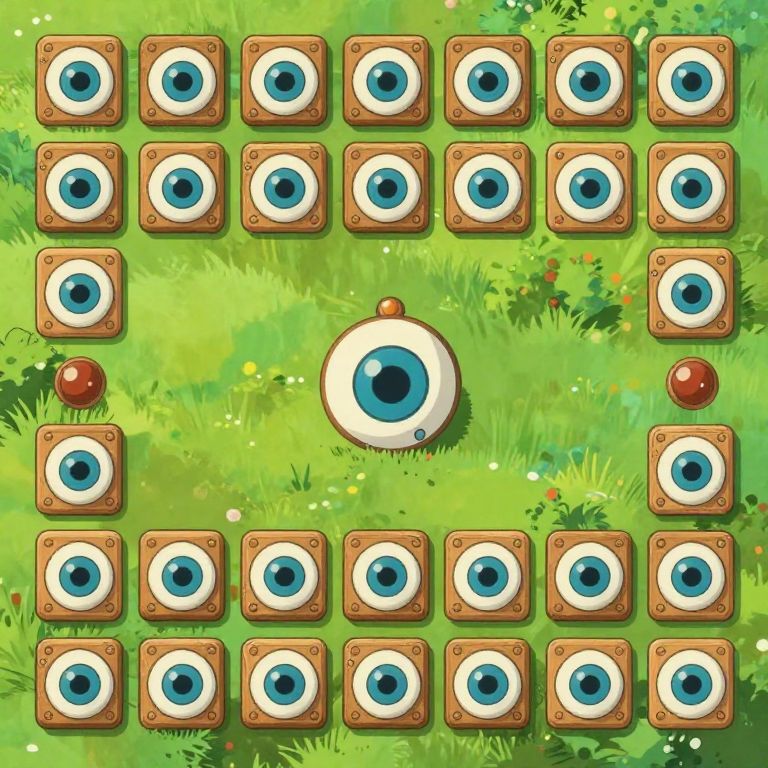 Digital drawing of a vibrant green grass field with 16 blue-eyed wooden eye slots arranged in a grid, one central larger eye, and a single red