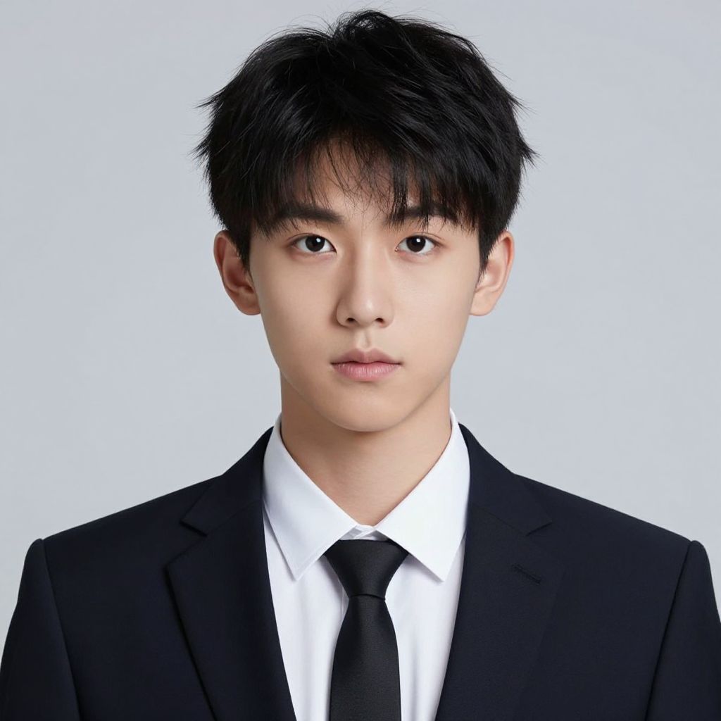 Photograph of a young Asian man with black hair, wearing a black traditional Chinese long-sleeve shirt, standing outdoors with a blurred green and brown