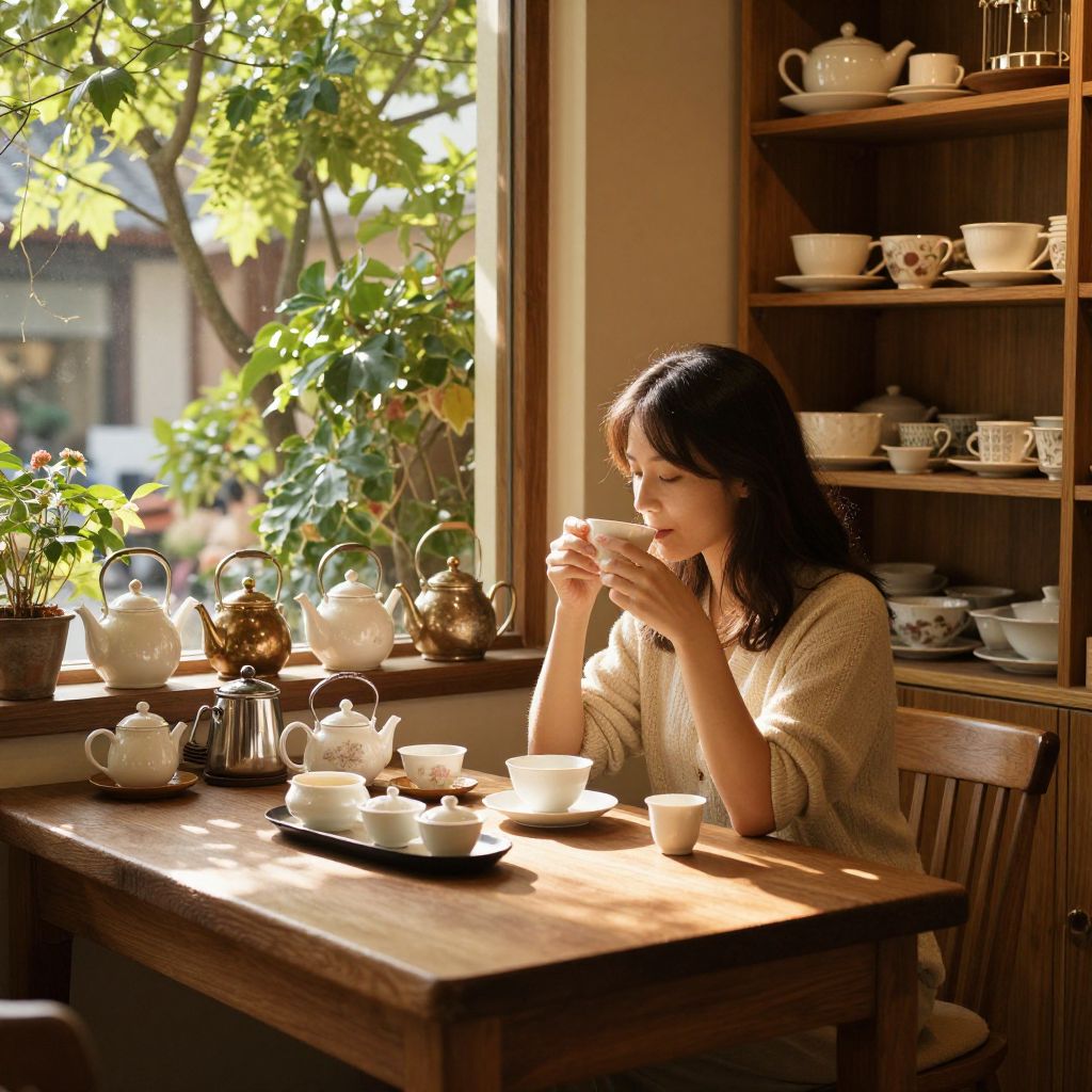 Cozy tea shop ambiance unfolds as a woman sits at a wooden table, sipping from delicate white cups surrounded by vintage teapots, shelves brimming with ceramicware, and warm, golden light streaming through a window framed by lush greenery.