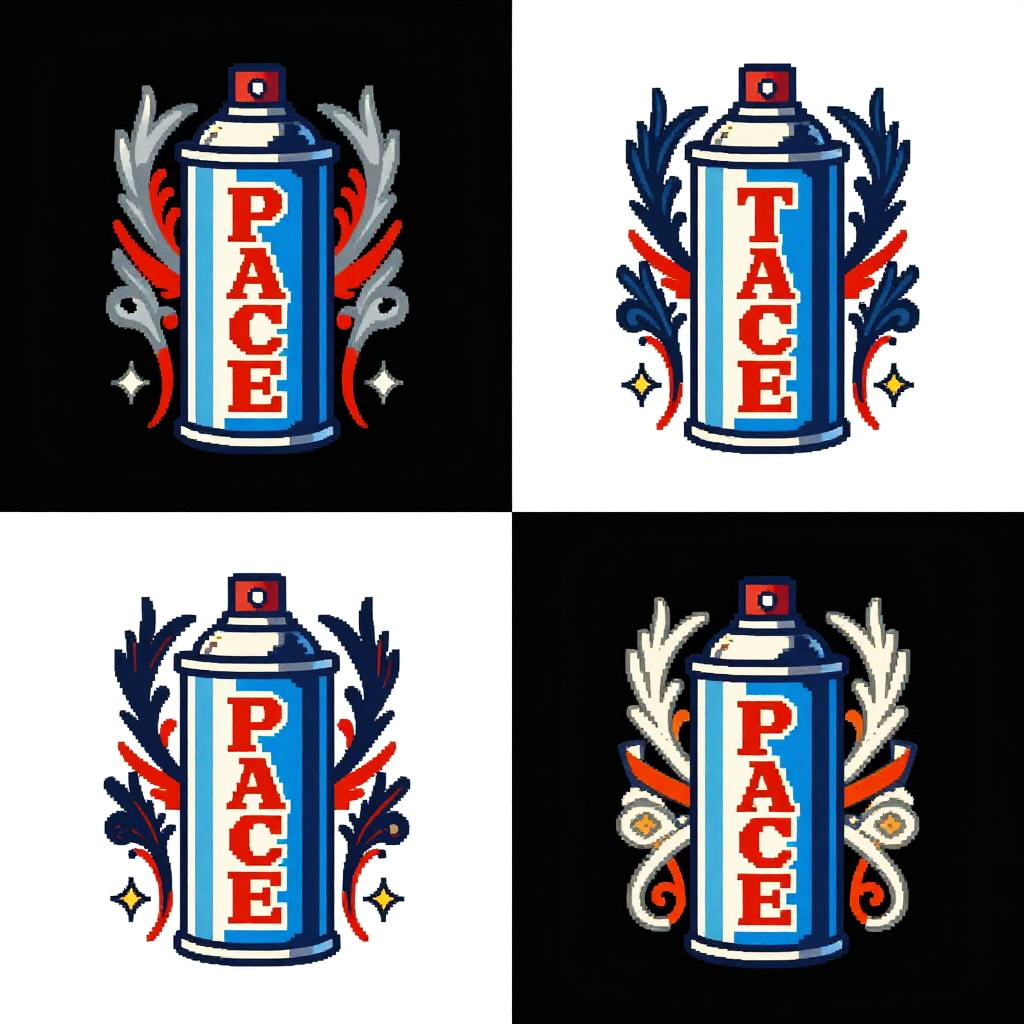 Digital illustration of four "PACE" logos: blue spray can with red "P" surrounded by red, blue, and white ornate designs on black
