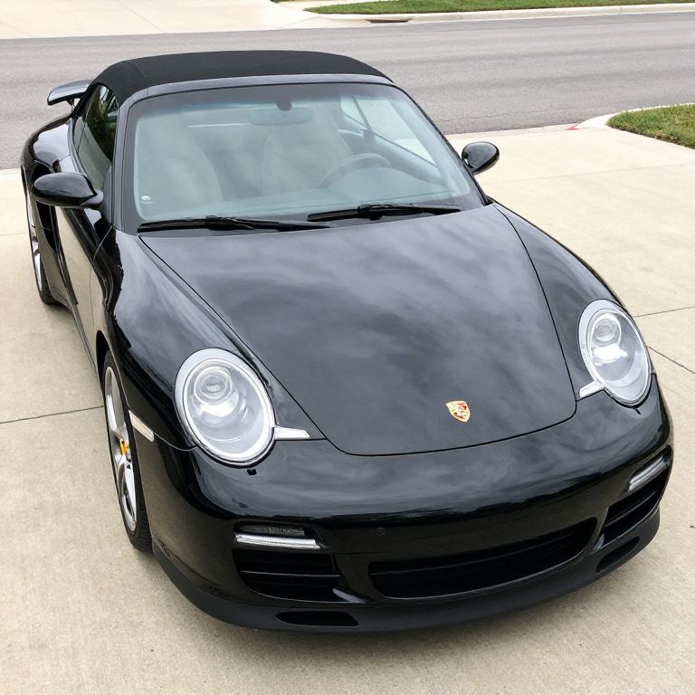 Glossy black 2009 Porsche 911 Turbo Cabriolet with manual transmission parked on a light concrete driveway, showcasing its sleek design and iconic emblem centered on the hood.