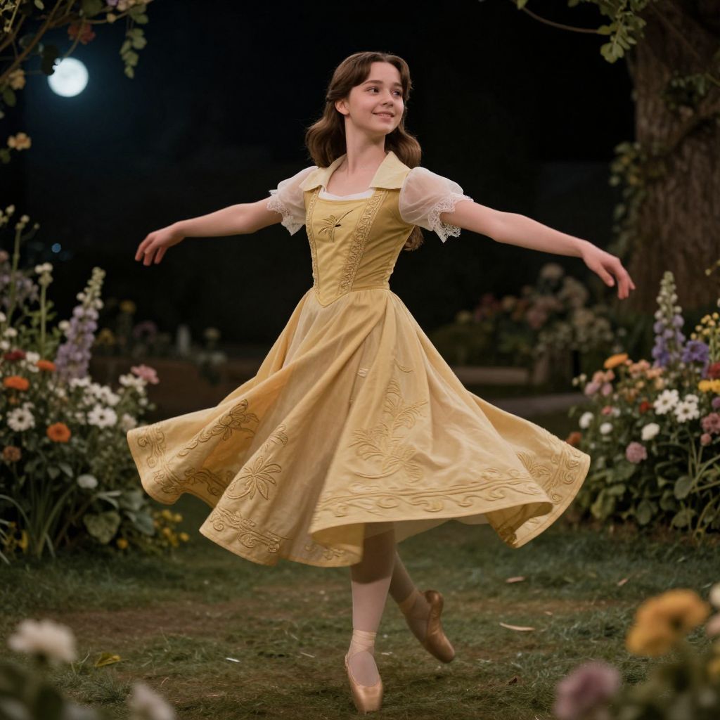 Photograph of a fair-skinned woman with brown hair in a vintage, yellow, knee-length dress with white puffed sleeves and intricate embroidery. She is mid-dance, arms outstretched, on a grassy path surrounded by colorful flowers and a dark, forested background. A full moon is visible in the top left corner. She wears beige, low-heeled shoes and looks joyful, with a slight smile. The scene is magical and reminiscent of a fairy tale, with soft lighting enhancing the romantic, whimsical atmosphere.