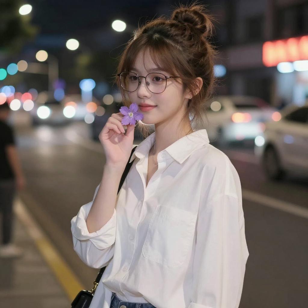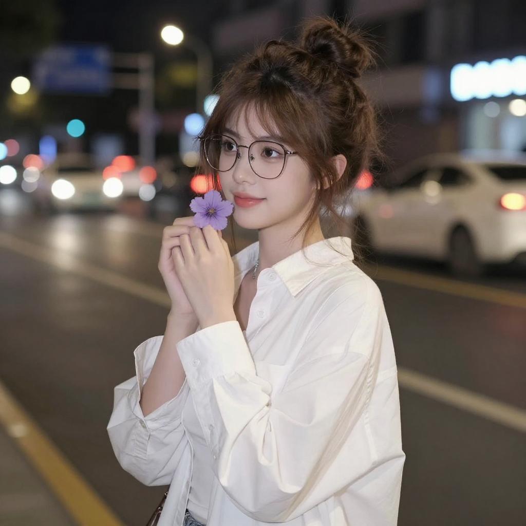 Photograph of a young woman with light skin and brown hair in a messy bun, wearing glasses and a white oversized shirt. She's holding a small purple flower close to her face, looking slightly to the side with a subtle smile. The background is a city street at night, blurred with colorful bokeh lights from cars and street lamps. She stands out against the dark, bustling urban setting.