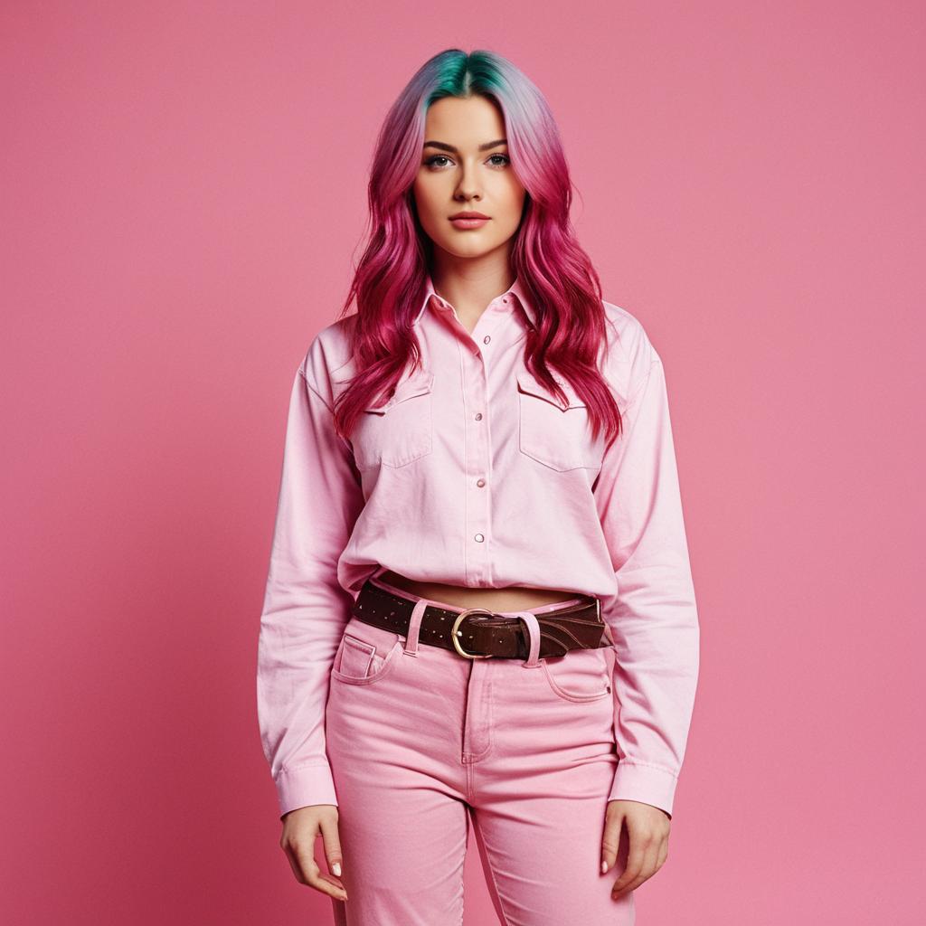 Portrait of a young woman standing against a solid pink background, wearing a light pink long-sleeve shirt and matching pink pants. She has striking long hair dyed in shades of pink and green, styled in loose waves. The outfit is complemented by a dark brown belt with a large buckle, and she gazes confidently at the camera. The image features a cohesive pink theme and simple background, emphasizing the subject's vibrant hair and coordinated fashion.