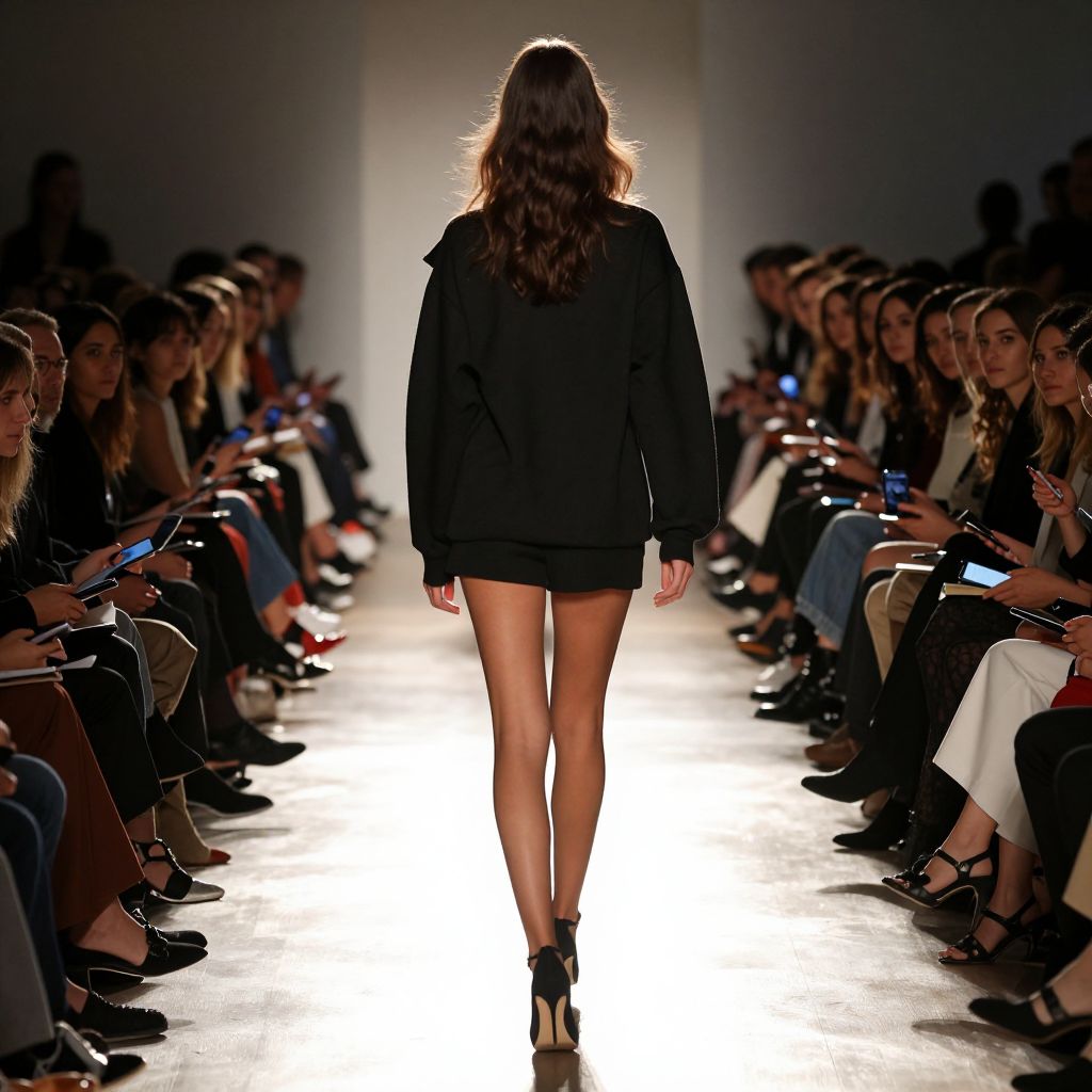 Model striding confidently down a luminous runway, her backlit silhouette framed by rows of seated spectators in a high-fashion event.