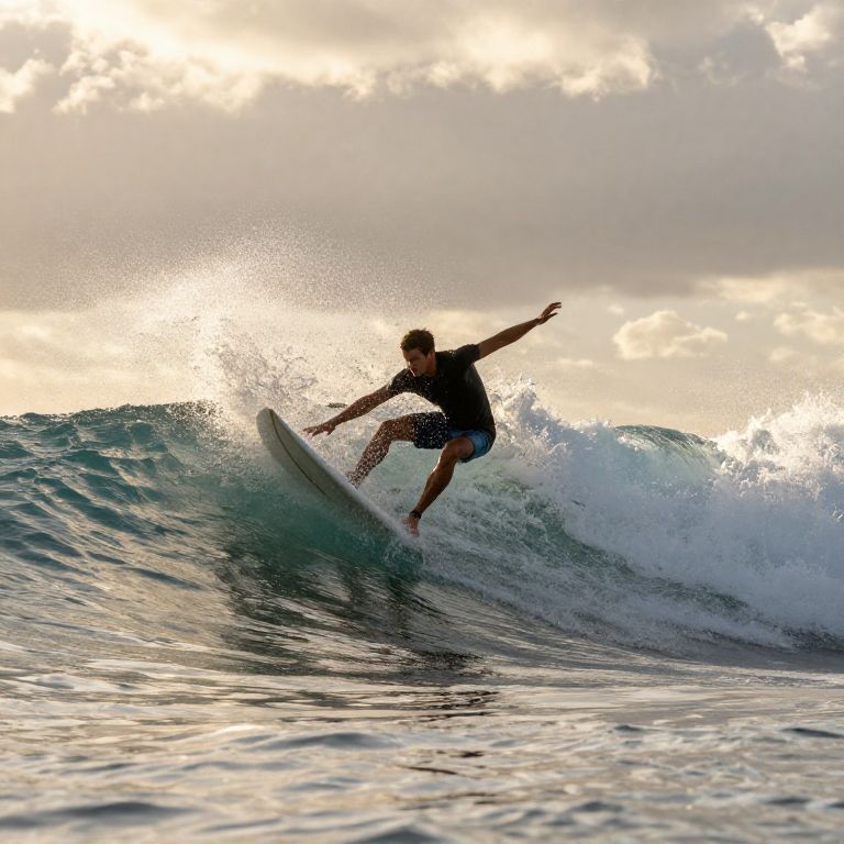 Surfers skillfully balancing on surfboards amid crashing waves, spray of seawater caught mid-air, dramatic clouds overhead with warm sunlight piercing through, realistic water reflections and dynamic wave shapes, intense and adventurous mood