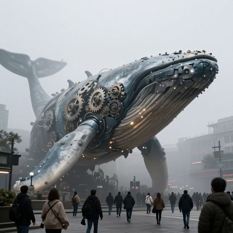 Photograph of a large, metallic, whale sculpture with intricate gear mechanisms on its side, standing in an urban plaza. The sculpture has a shiny, reflective surface with a mix of silver and blue hues. Surrounding the whale are numerous people dressed in winter clothing, walking or standing, with tall buildings and streetlights in the misty background. The whale's mouth is slightly open, revealing glowing lights inside. The atmosphere is foggy, adding a mystical feel to the scene. The plaza is paved and features a few small trees on the left.