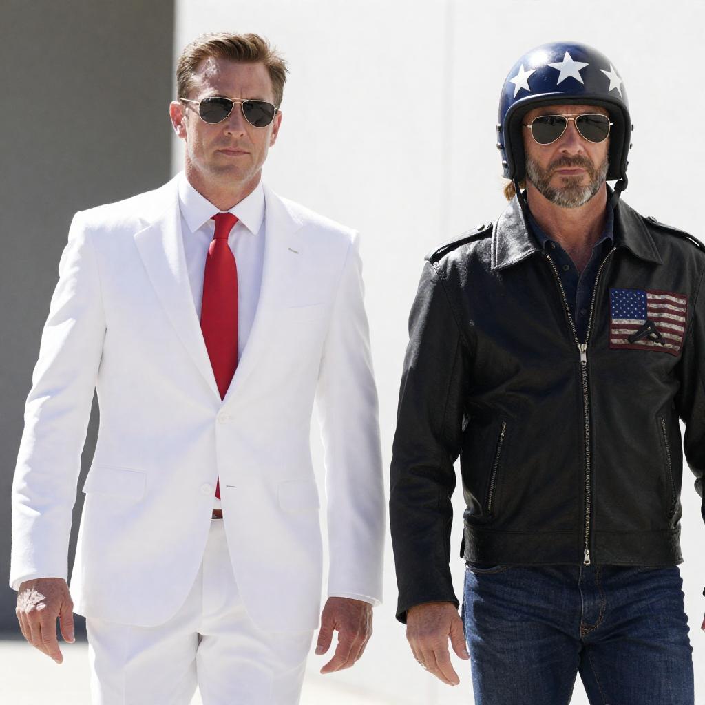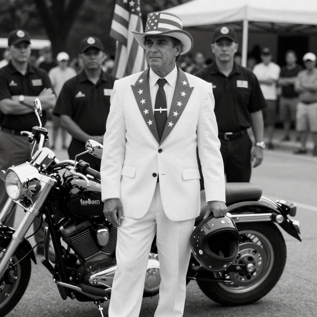 Black-and-white photograph of a man in a white suit with star patterns, wearing an American flag hat, standing in front of a motorcycle. Behind him, several people in dark clothing stand, and an American flag is visible. The man holds a helmet in his left hand. The background includes a street and a group of onlookers.